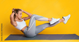 Fitness Workout. Young Woman Doing Bicycle Crunch Abs Exercise Over Pink Studio Background. Panorama