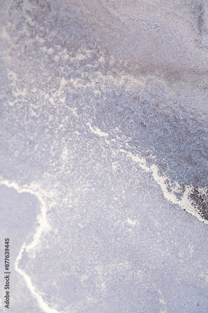 A close-up view of a natural, textured surface featuring a silver-white line winding through a lavender background