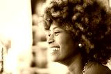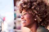 Side view of a cheerful African young woman outdoors enjoying the view. Close-up of a black woman in profile smiling. Copy space image.