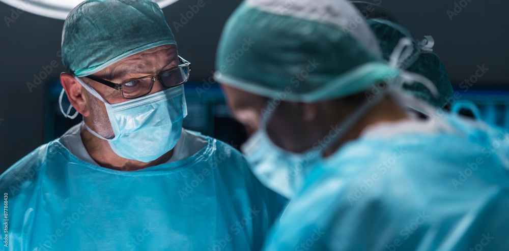 Team of medical doctors performs surgical operation in modern operating room using high-tech technology. Surgeons are working to save the patient in the hospital. Medicine, health and science.