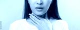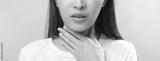 Sickness in inflaming asian young woman, girl use hand check self touch at sore throat, pain thyroid gland on neck or disease reflux, acid of suffer people on wall background. Medical and healthcare.