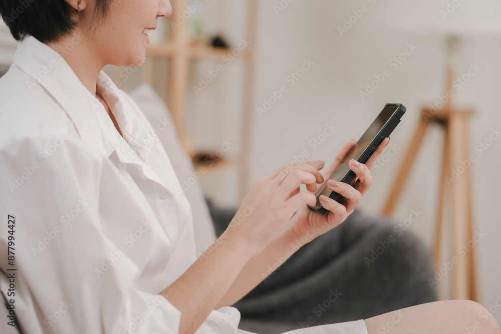 A woman is sitting on a couch and using her cell phone. She is smiling and she is enjoying herself