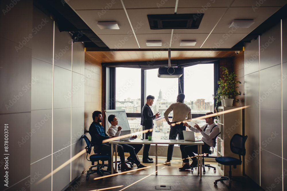 Long distance shot of business people of different nationalities collaborating in airy, spacious conference room of modern residence or hotel