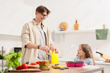 Happy father with his little daughter making toasts for school lunchbox in kitchen