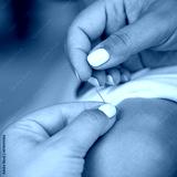 Acupuncturist inserting needles into a female patient's shoulder to relieve pain