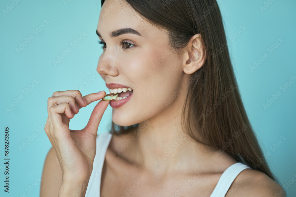 Nutrition. Woman Taking Fish Oil Supplement In Healthy Lifestyle Routine. Concept Of Wellness, Health. Close-up Shot Against Light Blue Background