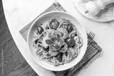 Italian summer seafood pasta directly above. Prawn, tomato and courgette, or zucchini, spaghetti in a white plate on a round marble table.