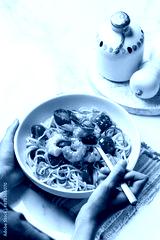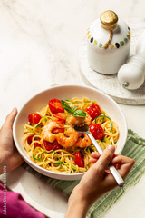 Girl eating italian summer seafood pasta with fork. Prawn, tomato and courgette, or zucchini, spaghetti in a white plate on a marble table. No visible face, high angel view. Copy space.