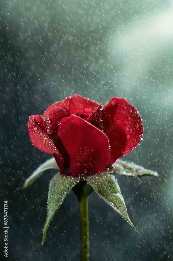 Red rose bloom, rain droplets glistening, delicate petals unfurling, vibrant color contrast, nature's beauty captured, floral close-up, soft focus background, garden bloom in rain