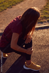 Young woman with knee and leg pain during jogging and exercise in urban park.