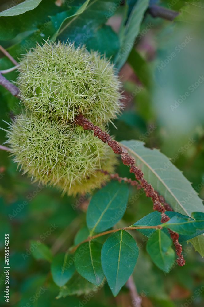 Unripe green chestnuts inside the thorny shell. Castanea sativa forest in Spain.