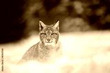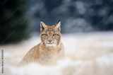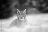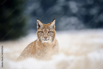 Eurasian lynx cub on sitting snowy ground