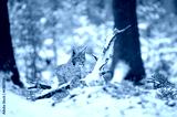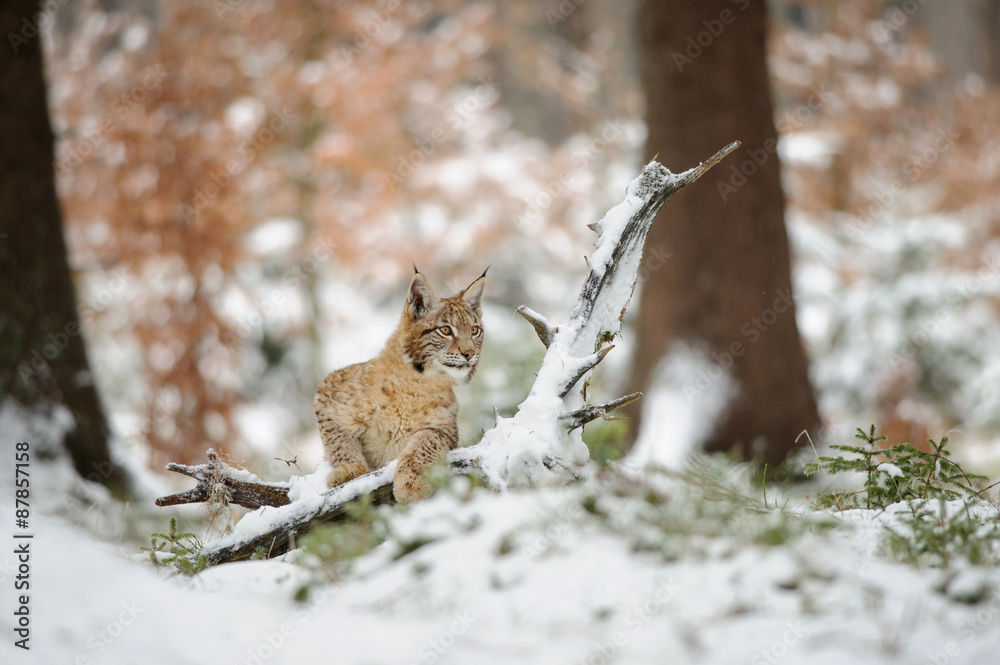 Eurasian lynx cub standing in winter colorful forest with snow