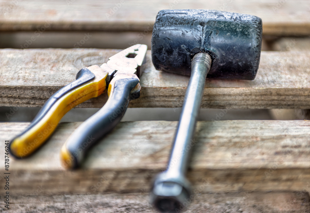 used tools , rubber hammer and pliers on wooden planks