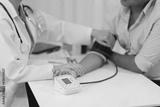 The doctor woman hand use the pulse meter to measure the pressure of the patient, medical checkup concept.