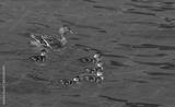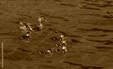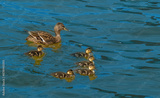 A duck with small ducklings swims through the calm waters of the lake in close-up on a summer day.