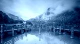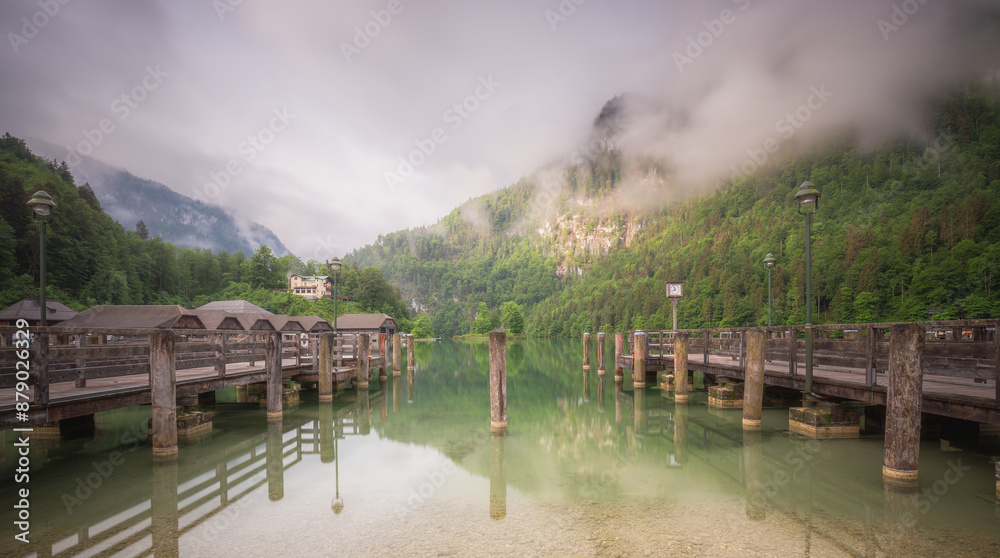 Tranquil lakeside dock with misty green mountains, peaceful and relaxation