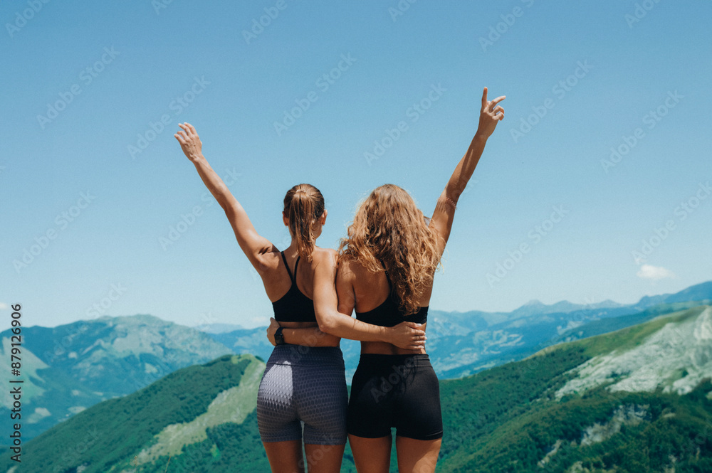 two sport long hair girls in mountains with exciting view.