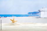 Desk of free space and summer landscape of sea and beach.