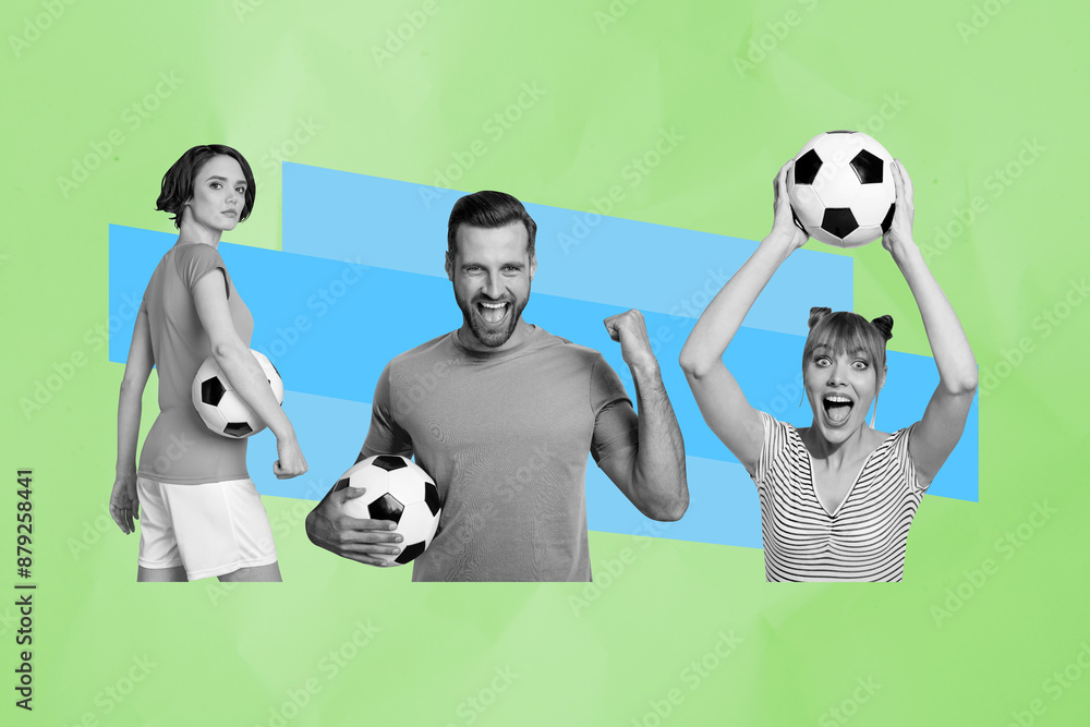 Poster collage picture of young team football fan supporter game fifa match hand hold ball isolated on creative background