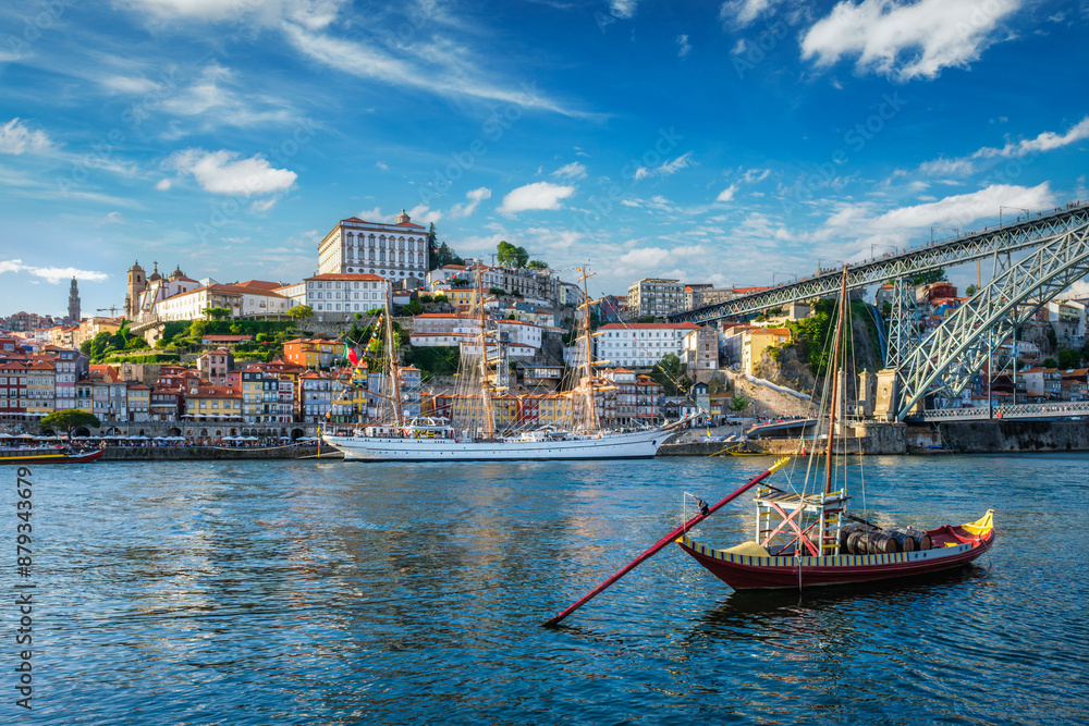 View of Porto city and Douro river with traditional boats with port wine barrels and sailing ship from famous tourist viewpoint Marginal de Gaia riverfront. Porto, Vila Nova de Gaia, Portugal