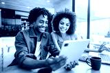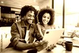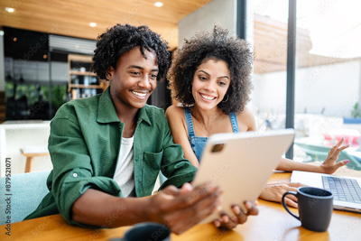 Young couple in a modern living room in a cheerful and connected atmosphere, looking at tablet, shopping online using a credit card. Smiling and enjoying their time excited about purchase