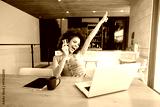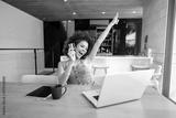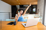 A young woman of African descent is sitting at a wooden table in a modern living room, raising her arm in excitement while holding a credit card and looking at her laptop. celebrating