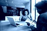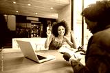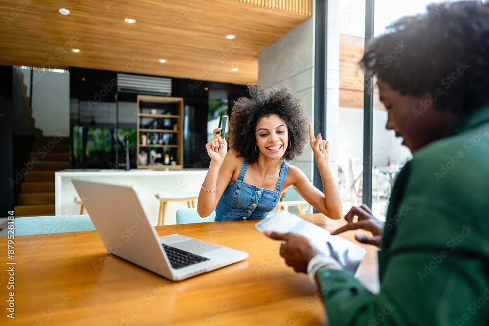 A young couple of African descent is sitting in a modern living room, both smiling and enjoying their time with digital devices creating a cheerful and connected atmosphere