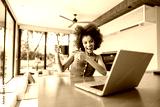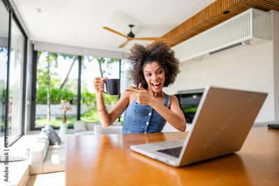 A young smiling woman with curly hair is sitting at a wooden table in a modern living room, looking at her laptop, holding a cup, and enjoying a coffee and online conversation with a friend