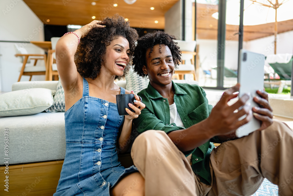 A young couple of African descent is sitting in a modern living room, both smiling and enjoying their time with digital devices creating a cheerful and connected atmosphere