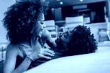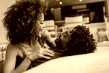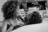 A young cheerful couple of African descent lying on a couch of a modern living room having an intimate moment of love and affection