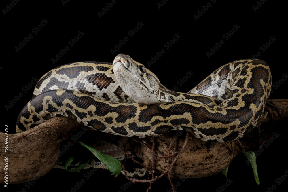 Python molurus bivittatus isolated on black background, Burmese python snake on branch, non-venomous snake