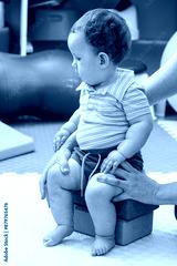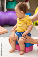 Baby boy with body hypotonia receives physical therapy from female rehab specialist during physiotherapy session. Early childhood intervention