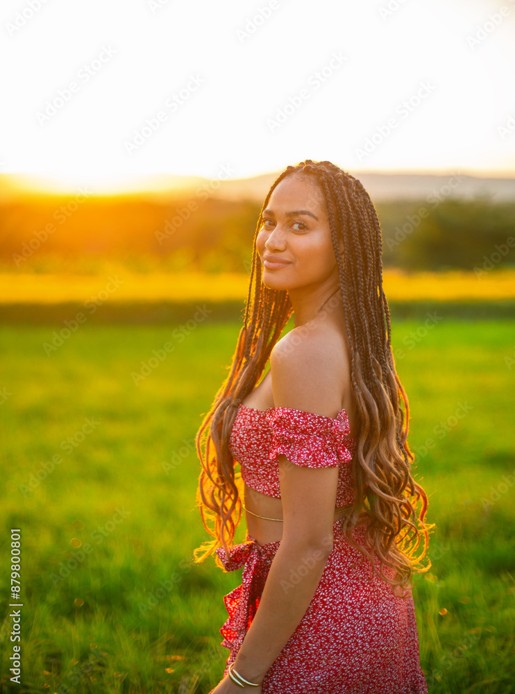 happy young black woman in a red dress on the wheat field in sunset light. future family concept