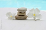 plumeria tropical flowers and pebbles light white blue spa relaxation background, turquoise water, soft focus