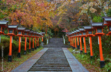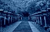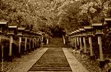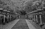 Traditional lamp posts beside the stairs in the Kurama Dera Temple, Kyoto, Japan.