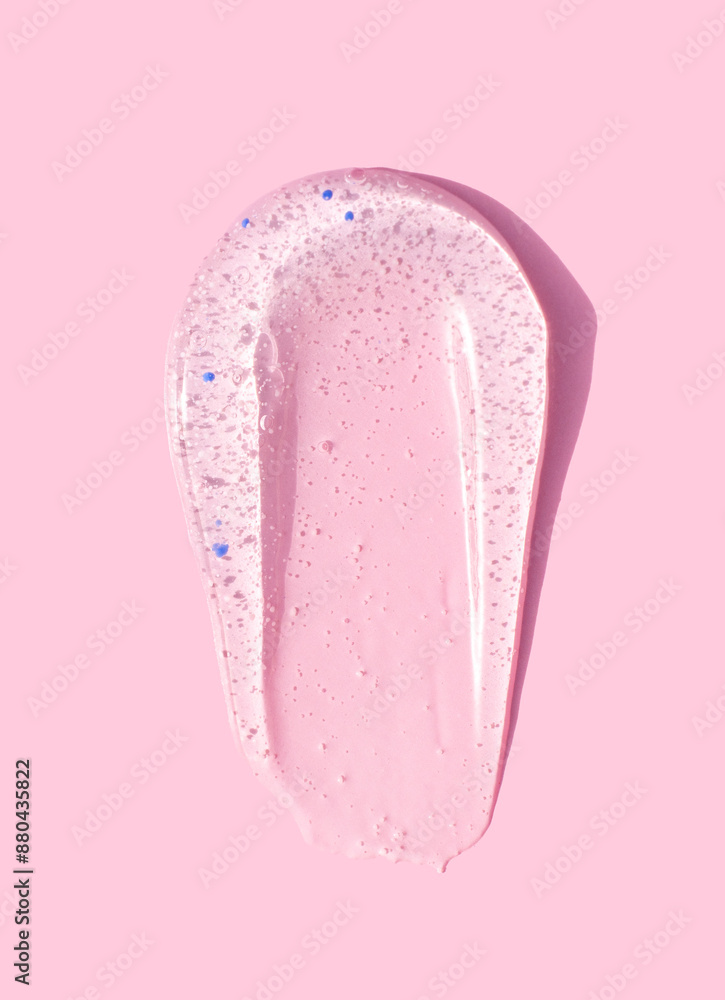 smears round drop of peeling gel test sample of scrub cosmetics on pink background