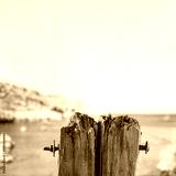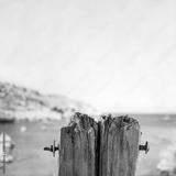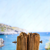 Tree stump as a woden table background with beautiful landscape and seascape and blue sky and mountain island in distance. Copy space for products and objects display.