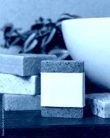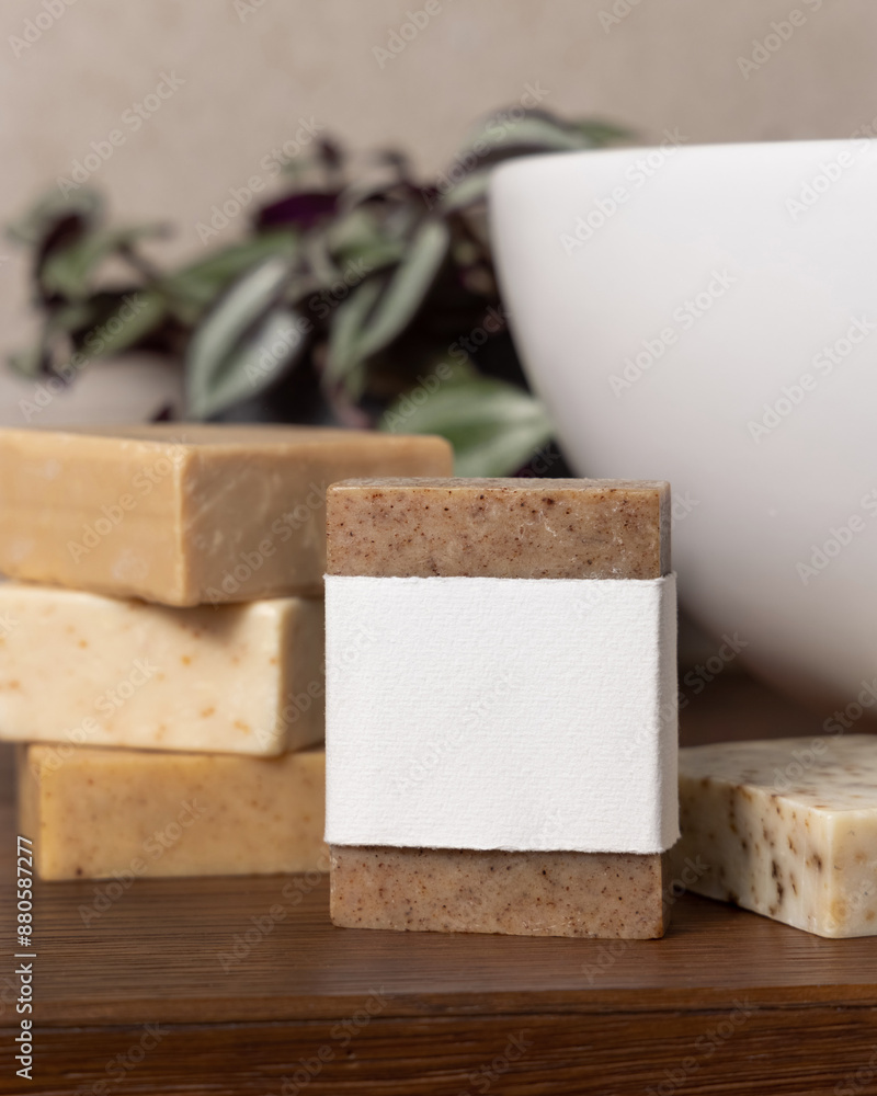 Soap bar with blank label near green plant and vessel basin on wood in bathroom, mockup