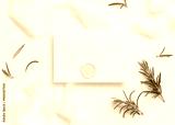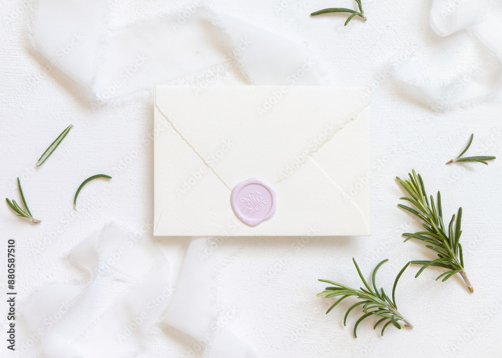 Blank sealed envelope near white silk ribbons and rosemary leaves top view, wedding mockup