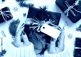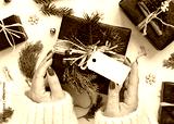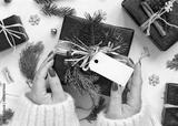Hands with Christmas present with horizontal blank gift tag, with fir branches and decor, Mockup