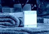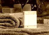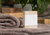 Soap bar with blank label on brown folded towels near green plant in bathroom, mockup