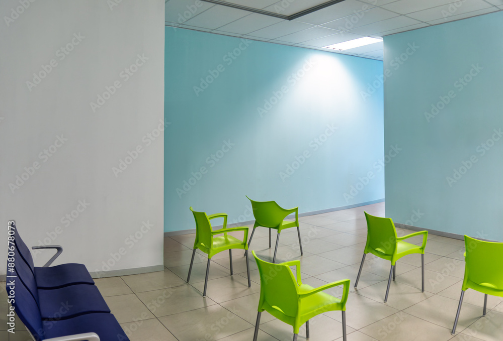 generic partitioned waiting room with plastic green chairs and blue wall