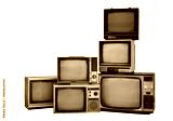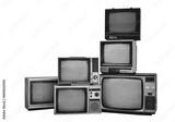Retro old televisions pile on floor in front with clipping path isolated on white background. Antique and vintage style, TVs blank screen display