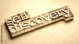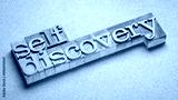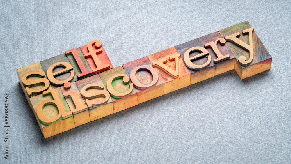 self discovery text in letterpress wood type, exploring, learning, setting goals and personal development concept