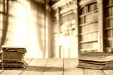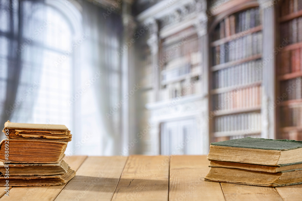 Old books on wooden table top in library interior and bright window background. Educational concept and copy space for products. Montage accessories display.