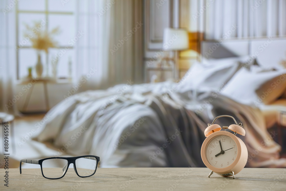 Alarm clock on wooden table top. Blurred background of bright bedroom with bed in cozy home interior. Fresh early morning and table with copy space for products. Montage product display.
