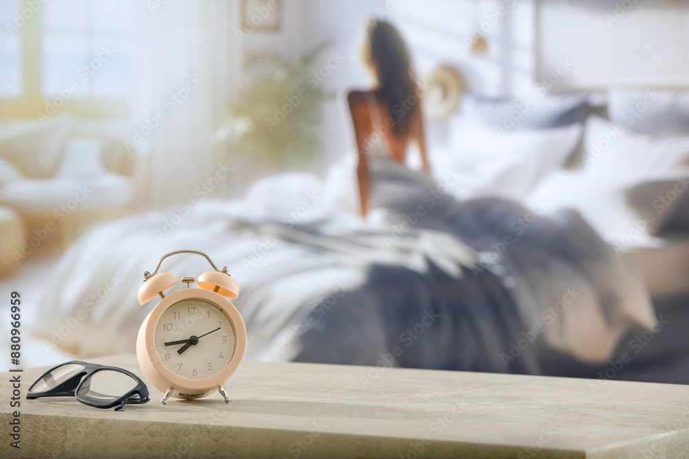 Morning Wake-Up Scene – Blurry Female Silhouette and Alarm Clock on Bedside Table