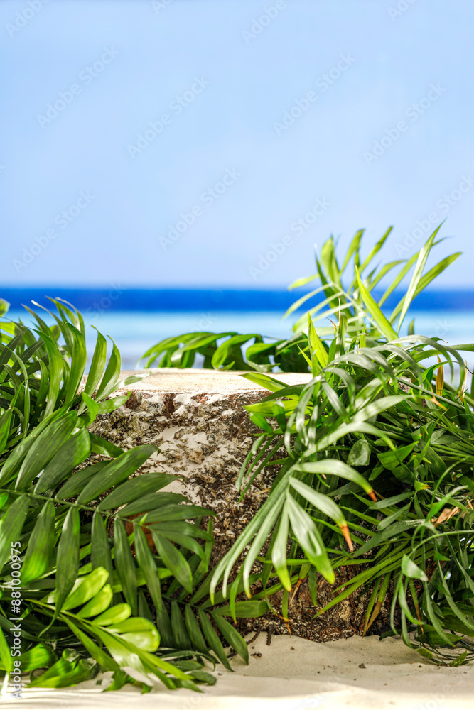 Wooden trunk with empty copy space with palm tree leaves and sea, sky and tropical beach background.