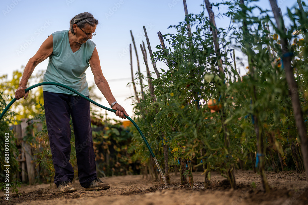 An elderly person watering plants in a garden with a hose on a sunny day. The garden is lush with green plants and colorful flowers. The person is wearing a sleeveless shirt and glasses.